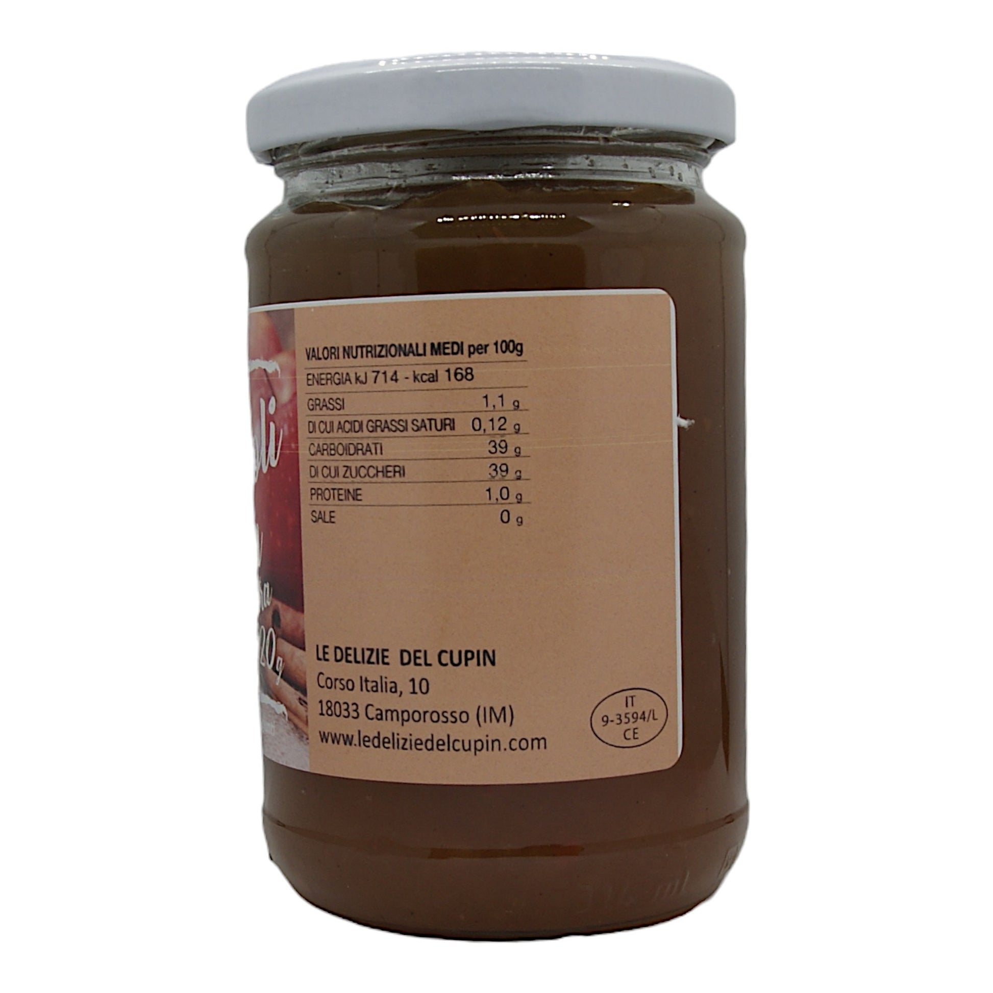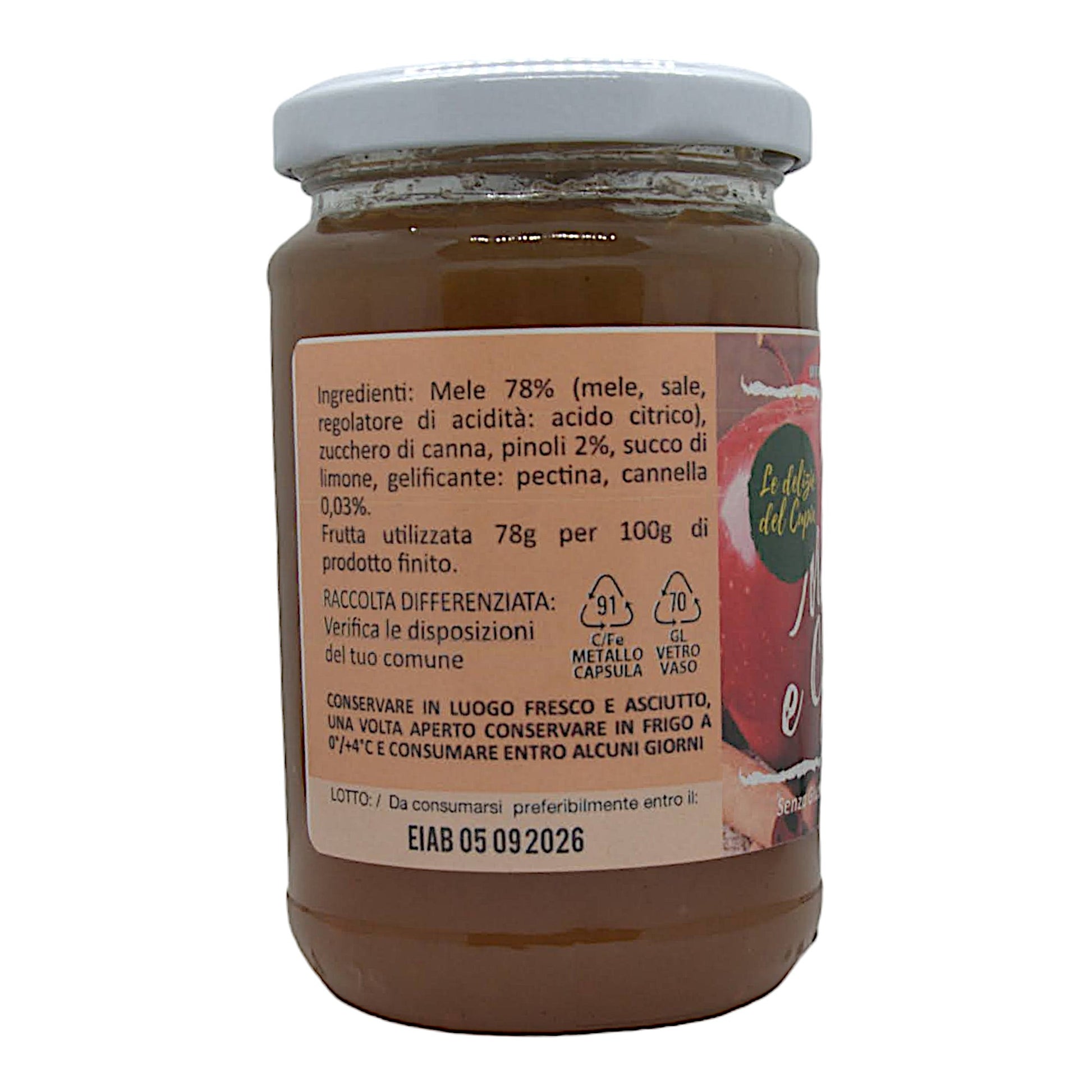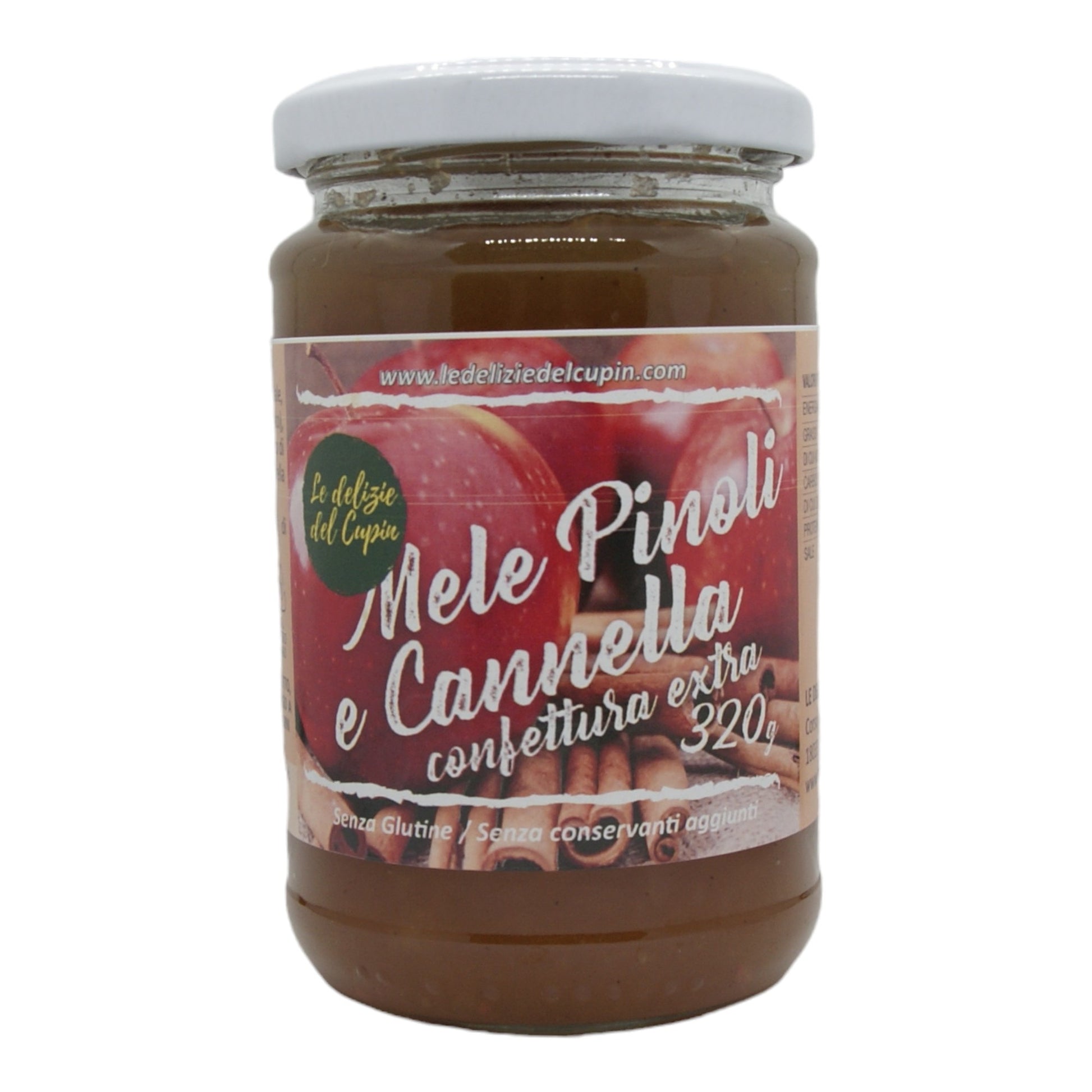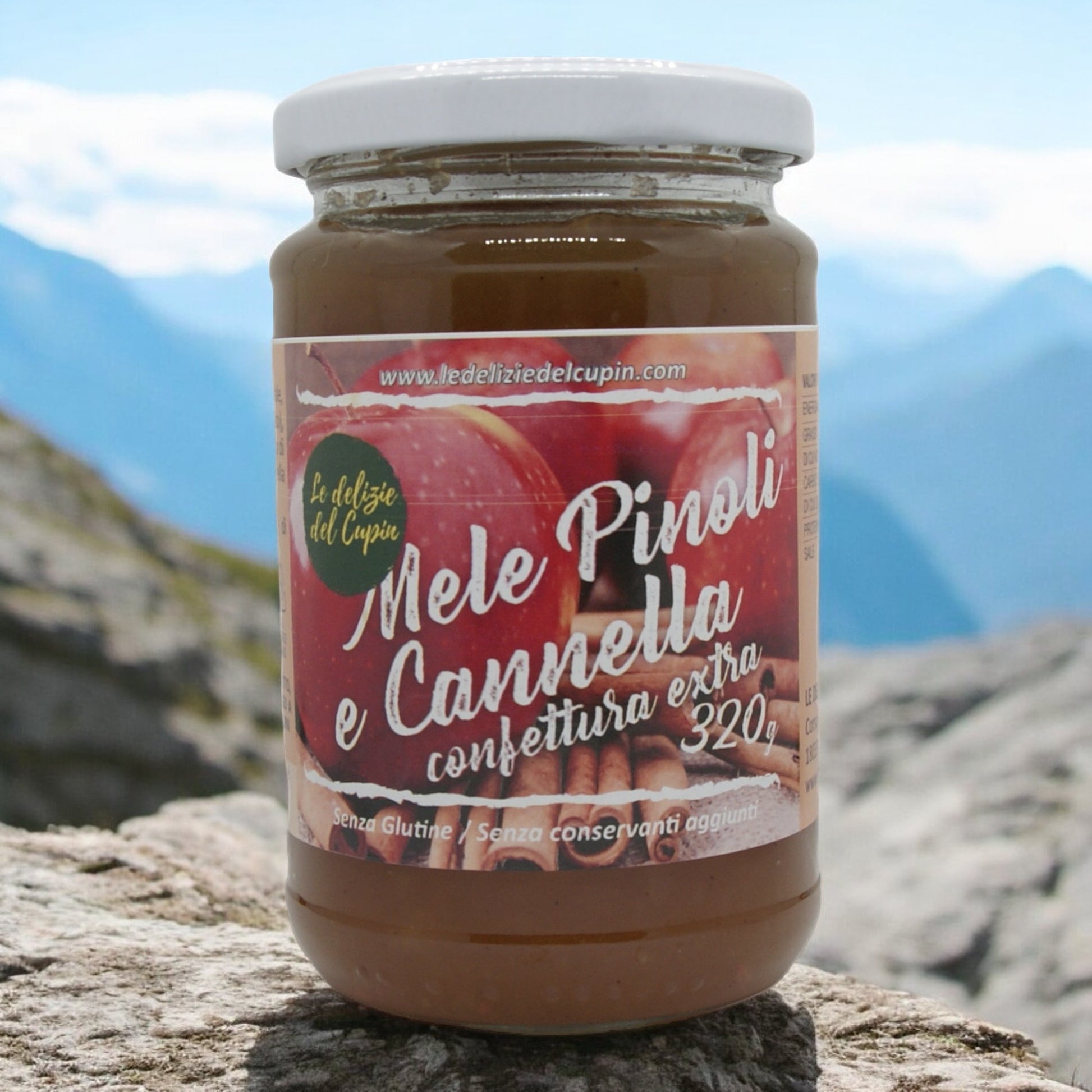 La confettura extra mele, pinoli e cannella "Le delizie del Cupin" è una prelibatezza artigianale che unisce la dolcezza naturale delle mele con il sapore aromatico della cannella e la croccantezza dei pinoli.